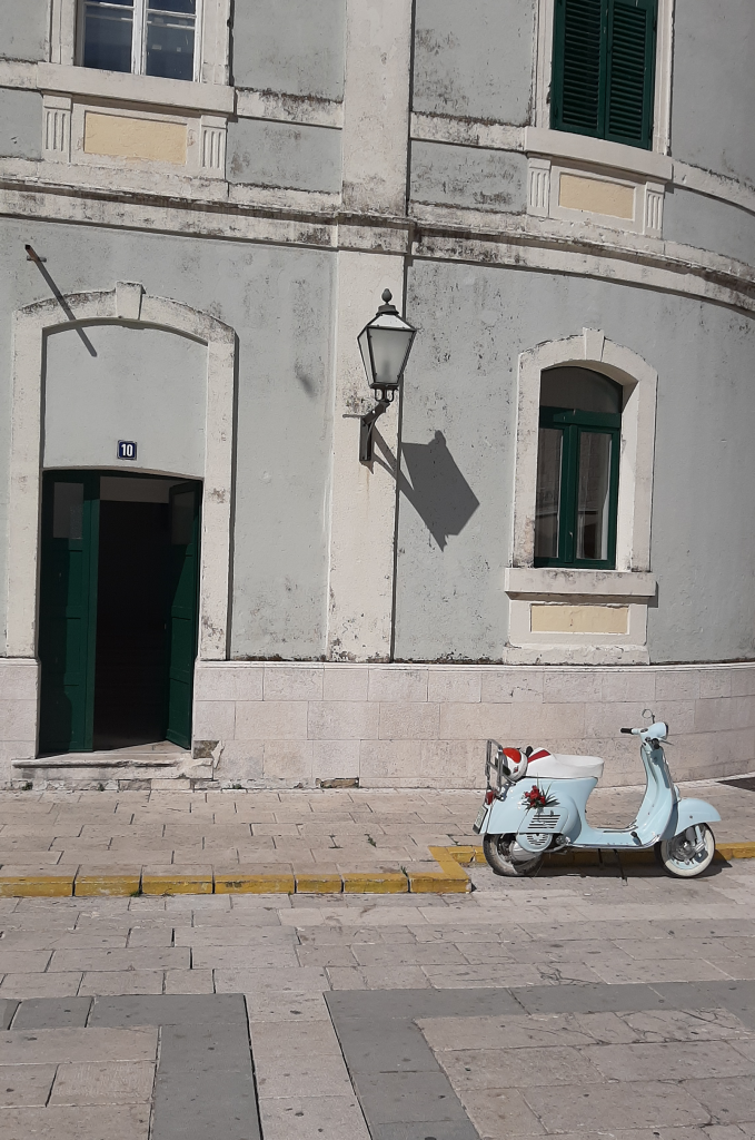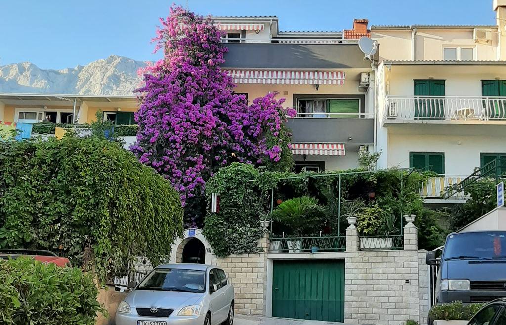 Смештај нам је, кажу, два минута хода од кампа, где је пристао аутобус. Иако не пешачимо дуго, тешко је у двориштима не приметити цветове олеандра који надмашују човекову висину. Винова лоза, која прави хлад изнад оно мало паркинг места испред куће, неизоставан је део пејзажа, а свако мало веће двориште има бар једно стабло смокве. Лоза са лила цветом заокупља моју посебну пажњу, не прави само хлад испред куће, већ покрива и део терасе, па се сакривен од погледа пролазника може уживати у њеном хладу. На неким кућама су шкуре*(жалузине) на прозорима затворене. Ту су вероватно смештени туристи, који још увек спавају. На другима, на којима су прозори и балконска врата отворени, чује се вика и допире мирис из кухиње. У ствари, није то никакво викање, то Далматинци ћакулају* (разговарају).