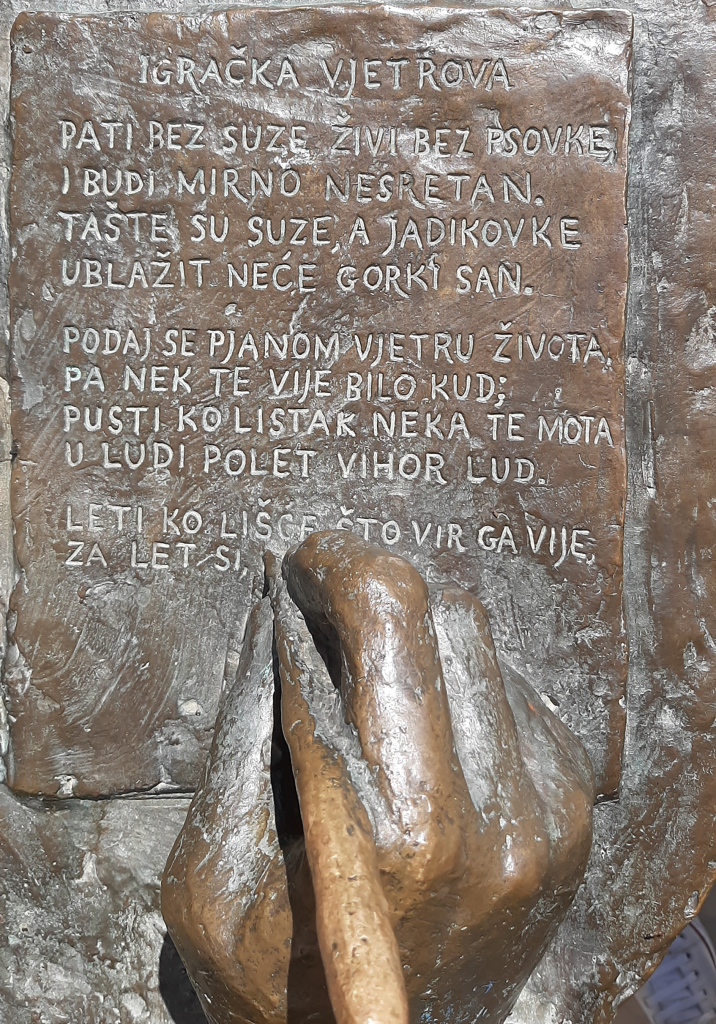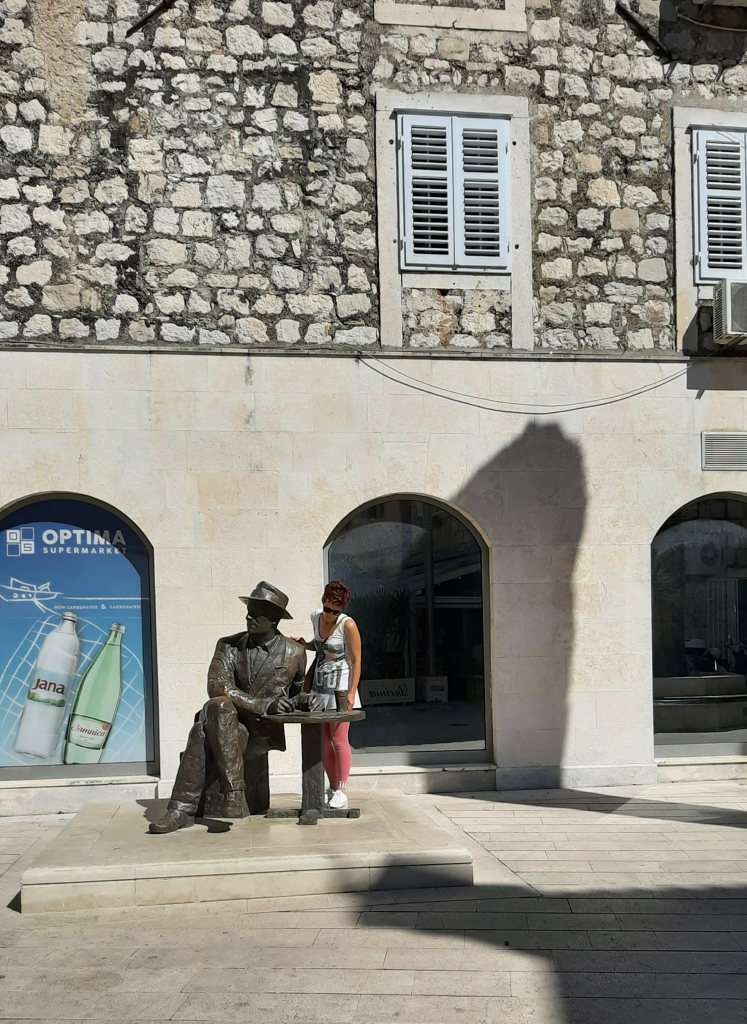 Наравно, морала сам да се фотографишем поред споменика, да бих веровала касније себи самој да сам била на Тргу Тина Ујевића и читала његову поруку случајним пролазницима пристиглим издалека.
